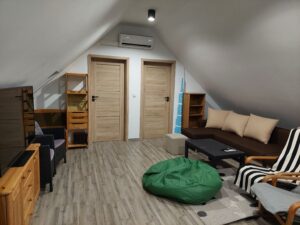 Zapraszamy do korzystania z sauny, która pomieści 6 do 8 osób. Piec nagrzewa się w pół godziny i w środku jest 90 stopni. Przed sauną jest prysznic z temperaturą wody ok. 10 stopni. Woda jest z własnej studni.